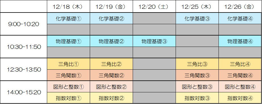 ※物理基礎復習講座は、他の講座と日程が異なります。