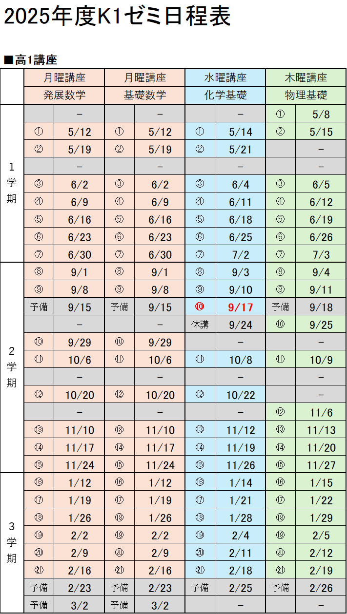 各講習の詳細は、時期が近づいたら実施要項にてご案内いたします。※季節講習の日程は変更になる可能性があります。