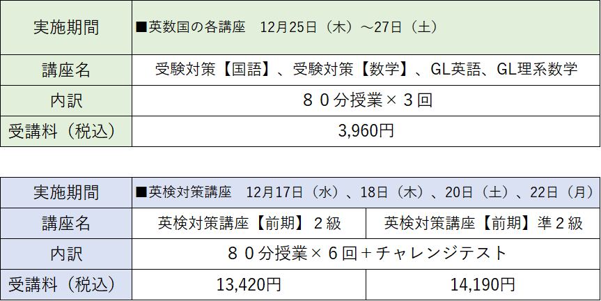 冬期講習は3回セットで3,960円(税込)となります。②英検対策講座(2級)は、1講座1回につき1,320円(税込/添削料なし)で、6回+チャレンジテストのセットで、13,420円(税込)となります。